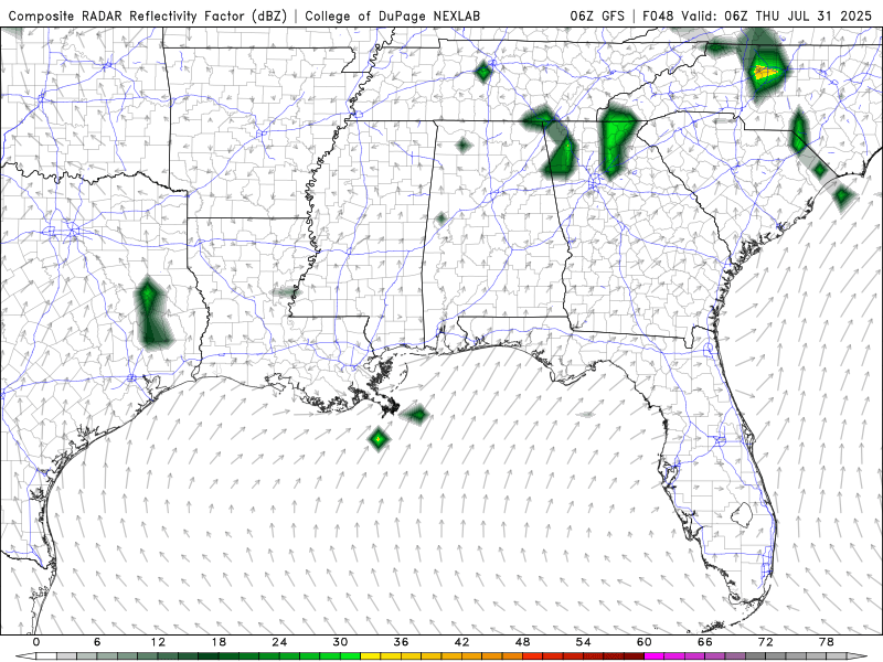Tuesday – Increased cloudiness with widely scattered showers. Best rain chances (30%) in Mississippi. Temperatures moderate slightly: highs 88–92°F. South winds 5–10 mph.