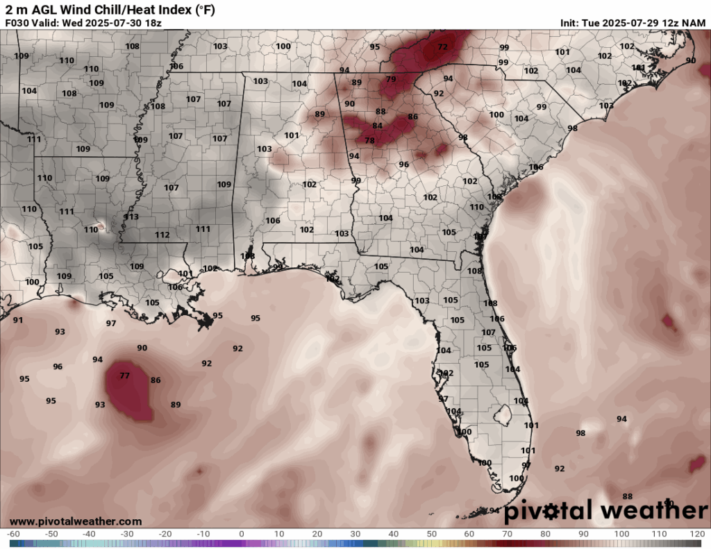 Heat index for Wednesday from the NAM model. //Courtesy: Pivotal Weather