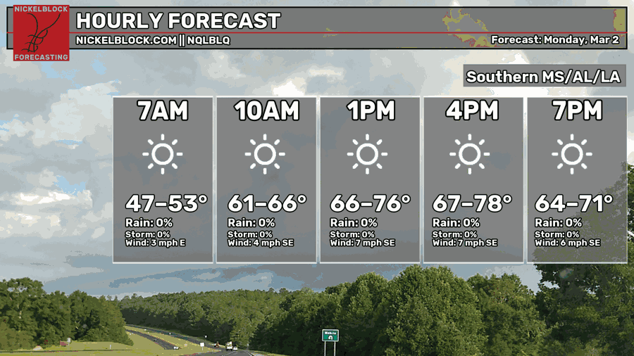 It’s gonna be a warm start to March! We’re going to be in the low 80s for the next few days before some rain chances come in closer to the weekend. Low temperatures will also increase as southerly winds will dominate and increase the inflow of Gulf moisture and close the diurnal temperature range. Air quality is also going to be a factor this week with several controlled burns and forest fires across Mississippi contributing to higher PPM (parts per million) and affecting people who are sensitive to air quality drops.