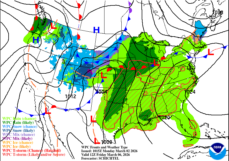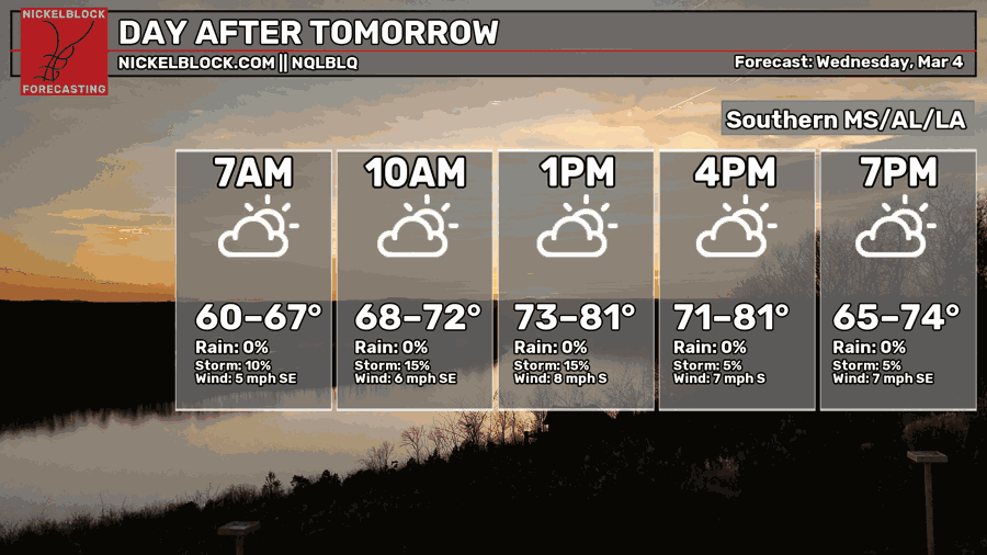 A tighter gradient between a low in the mid-Plains and the mid-Atlantic high will contribute to some gustier winds across the Gulf South. Expect some wind gusts tomorrow, so if you’re planning on burning, I probably wouldn’t. Temperatures will reach the low 80s in some areas by mid-afternoon. Overnight, we’ll only fall back to the upper 50s to around 60.