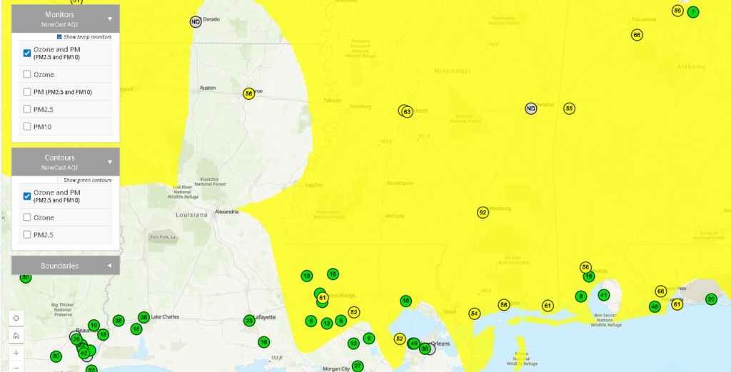 With many fires across part of the DeSoto National Forest and south Louisiana combined with southeasterly flow, air quality will take a dive across much of the Gulf South region. Those that are sensitive to the higher amounts of particles in the air will need to stay indoors today. Part of this is due to the capping inversion across the southern part of the state contributing to the low clouds and fog this morning.