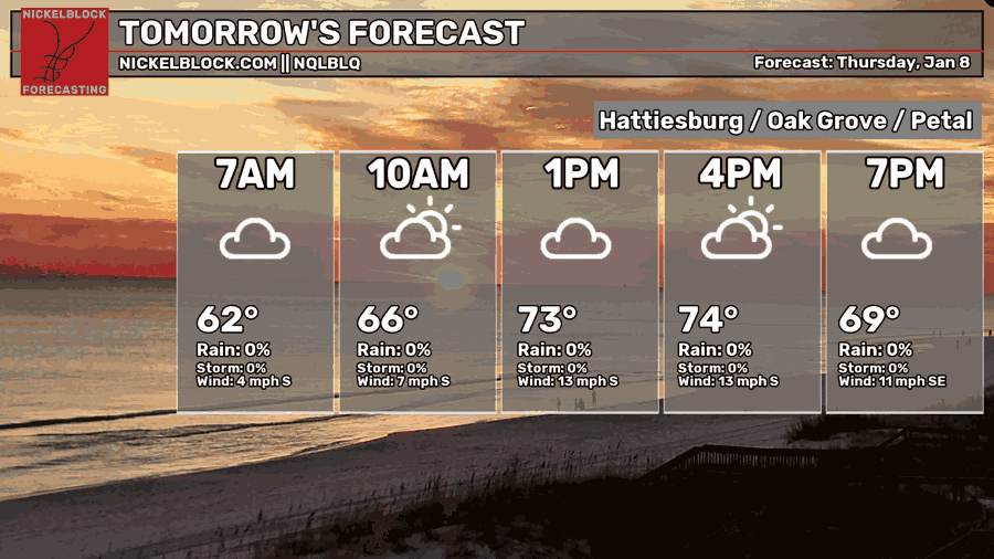 As the gradient tightens from the low, we can expect a gustier day tomorrow with winds from the South. It’ll be another mostly cloudy one with a high in the mid 70s and a low in the low 60s.