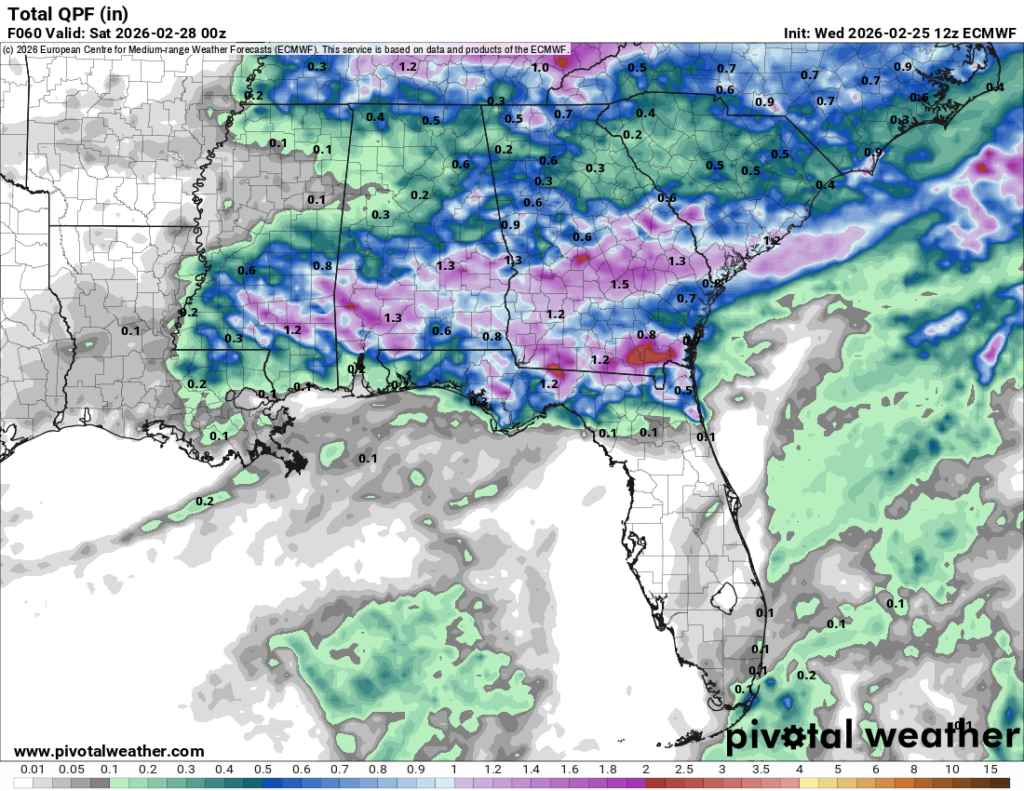 Rainfall totals from Thursday to Friday from the ECMWF model //Courtesy: Pivotal Weather