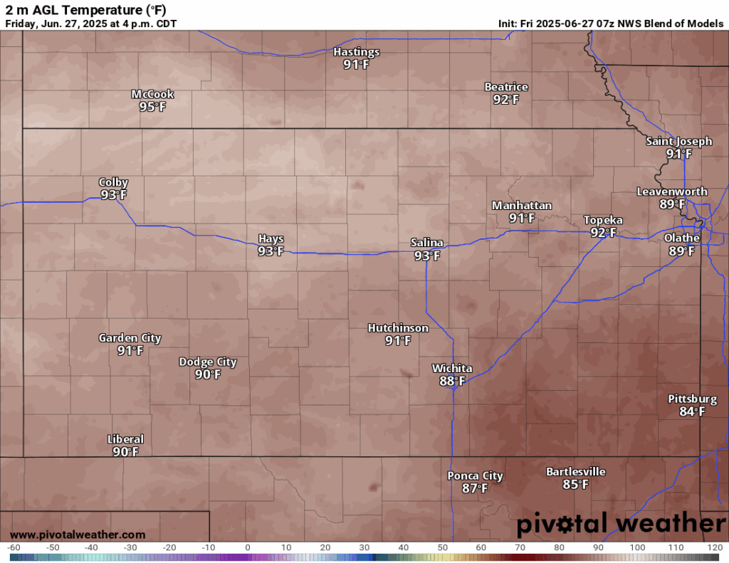 More organized thunderstorm activity is possible Sunday, as a “cold front” (more of a wind shift than anything) drifts southward into the state. A mid-level disturbance will traverse over the state and help trigger thunderstorm activity across central and eastern Kansas by the afternoon and evening hours. Some of these storms may be severe, but the primary hazard will be heavy rainfall given an extremely moist airmass in place over us. These showers and thunderstorms will continue through the overnight hours and into Monday, getting shoved to the south by the advancing front. Behind the front, temperatures will be a touch cooler (in the mid 80s to low 90s) for the rest of next week. Sporadic chances for isolated showers and thunderstorms will still exist daily throughout the afternoons and evenings, but otherwise widespread precipitation is not anticipated for the week of the Fourth of July.