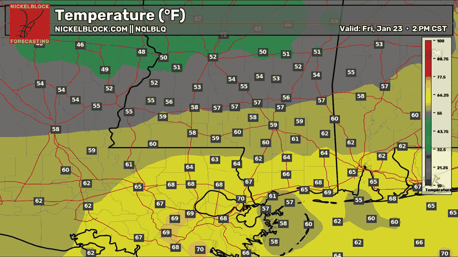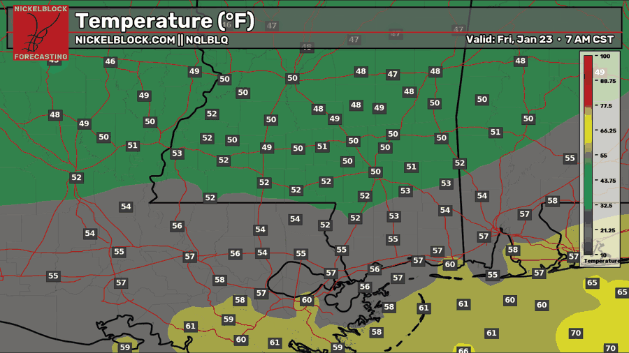 By the morning and throughout the day on Friday, skies will be overcast, but it’s looking like a mostly dry day. It’ll be a gray day, with a pretty big temperature contrast, as I mentioned earlier, which could help us understand who might see what by the time Saturday and Sunday come along. Mid to upper 50s for those north of Hattiesburg, and mid to upper 60s and low 70s for those further south.