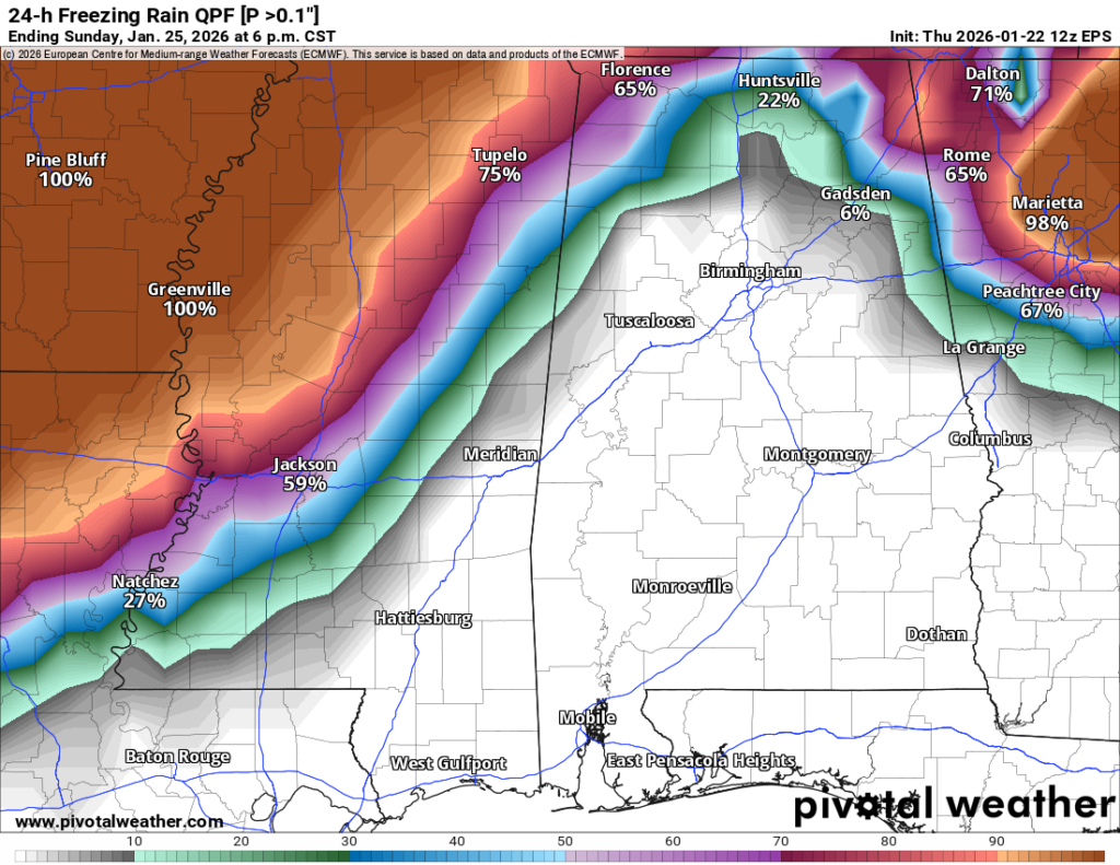 The good news is that the freezing rain threat has been taking a northward push in the model runs. There’s still a threat of freezing rain across the counties we cover, but the chance has decreased. For example, the EPS, which is an ensemble of model runs, shows the percent chance of freezing rain amounts being greater than 0.1″ above.