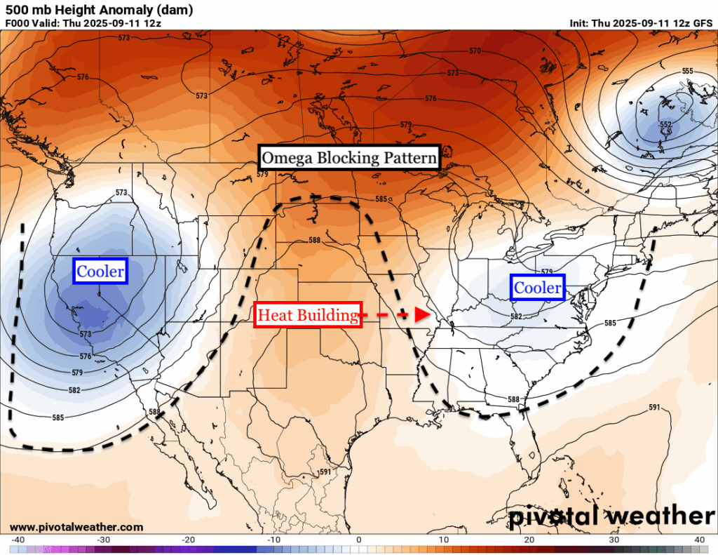 An OMEGA BLOCK is setting shape over the US with a ridge of high pressure building in the center of the country and two dips in the jet stream over the east and west. The ridge of high pressure will move east over the coming days and will bring up temperatures well above average to most of the plains, and eventually deep south and the midwest.