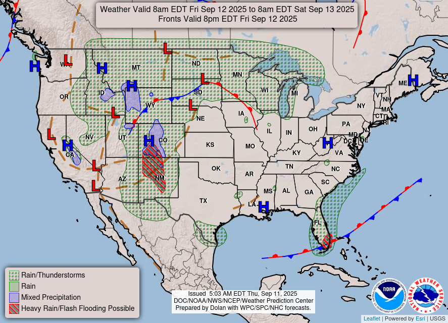 As you can see, areas in between the ridging and troughing near the Rockies are seeing a bunch of unsettled weather tomorrow. They have multiple fronts, a flash flooding potential, and even snow in the high elevations! This is typical for areas between ridges and troughs and it seems that will verify tomorrow.