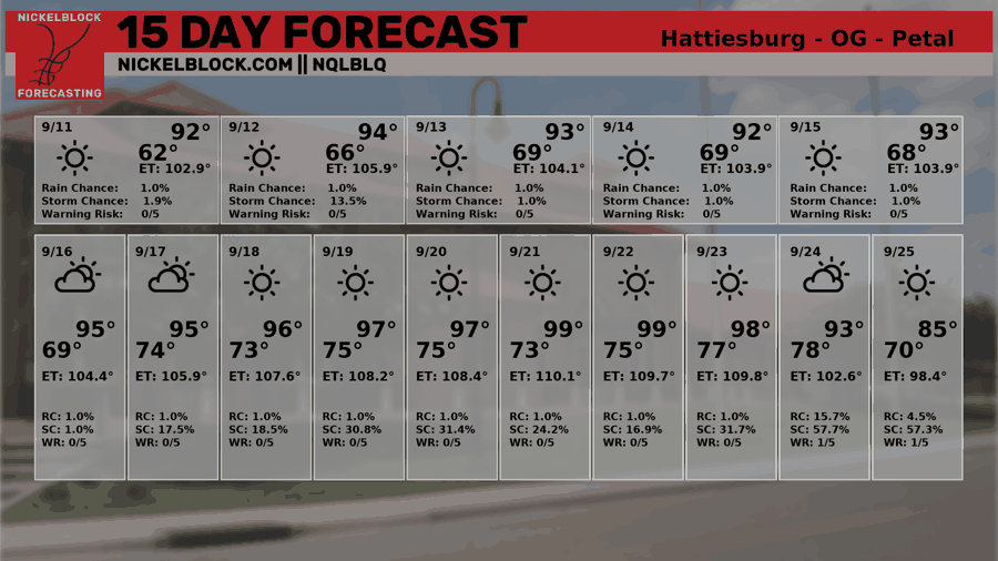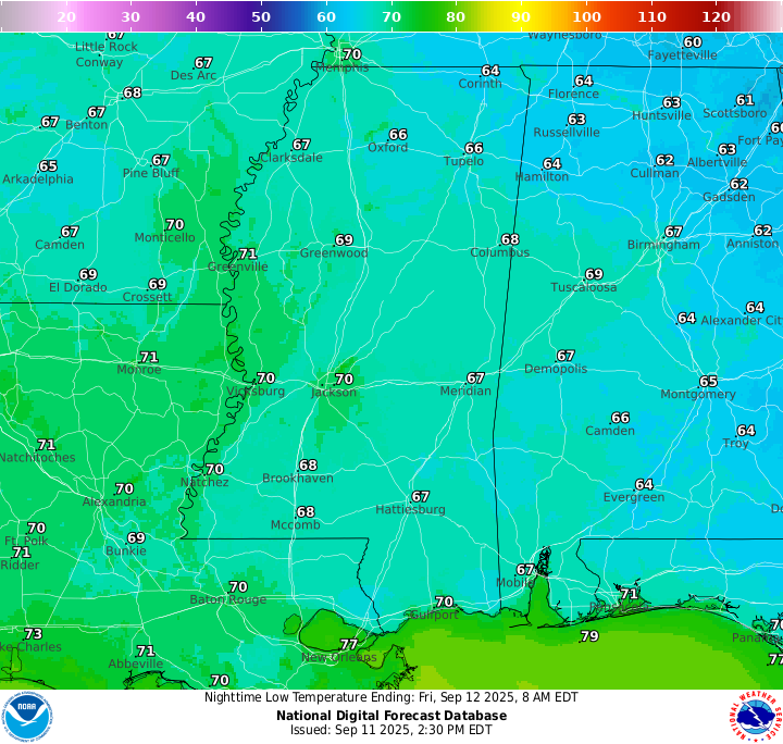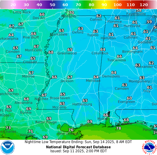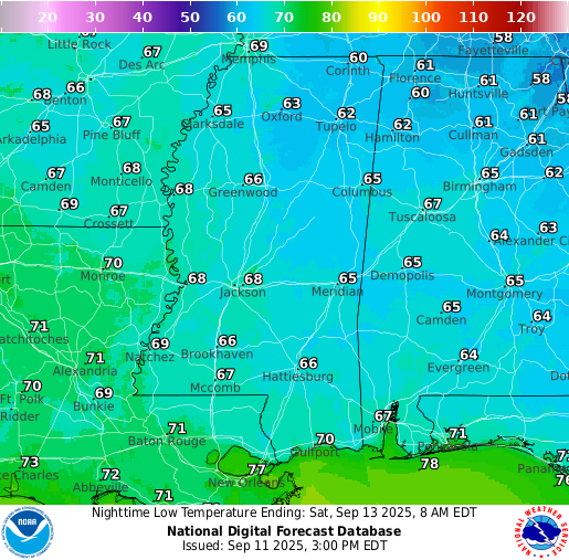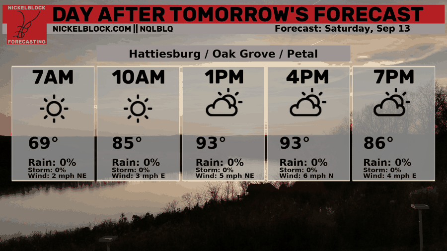 Low temperatures overnight tonight sit in the high 60s near Hattiesburg and into the 70s closer to New Orleans. Expect a very clear sky tonight with very few clouds at all, and certainly no rain.