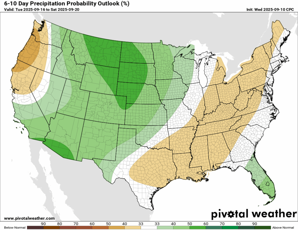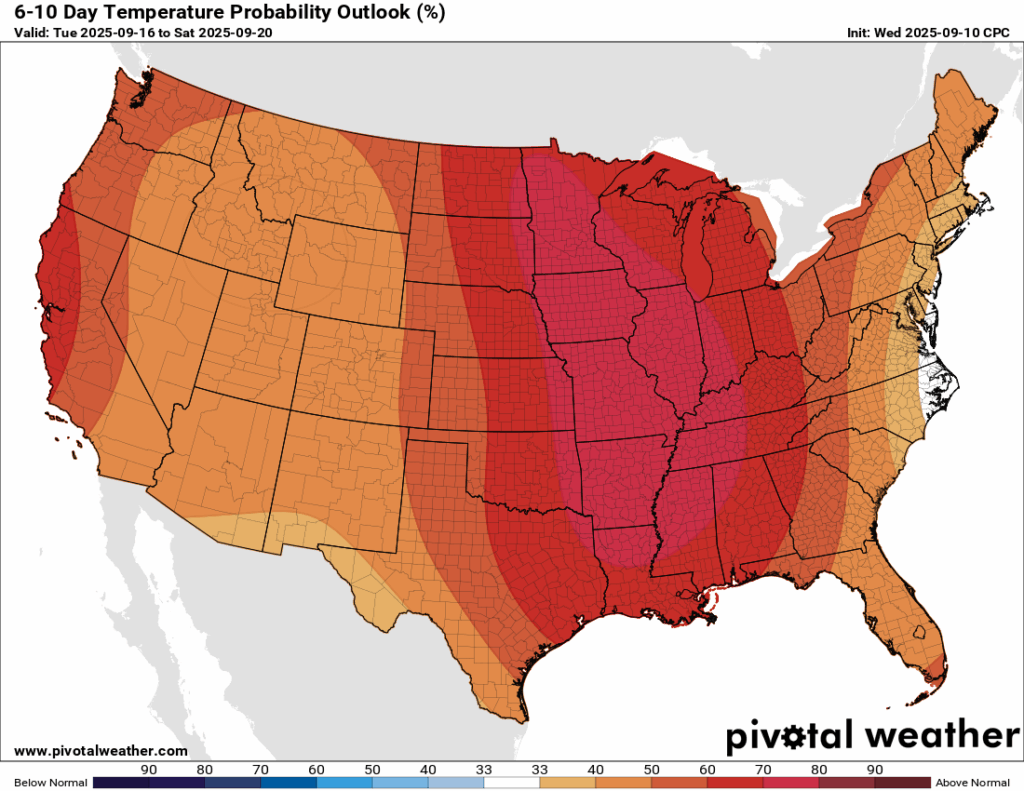 There is no end in sight for the heat and lack of rain for us. The next 6-10 days from the Climate Prediction Center shows a very high probability of above normal temperatures for us as the ridge builds out east. Rainfall is also expected to be below normal, which could worsen our drought conditions…