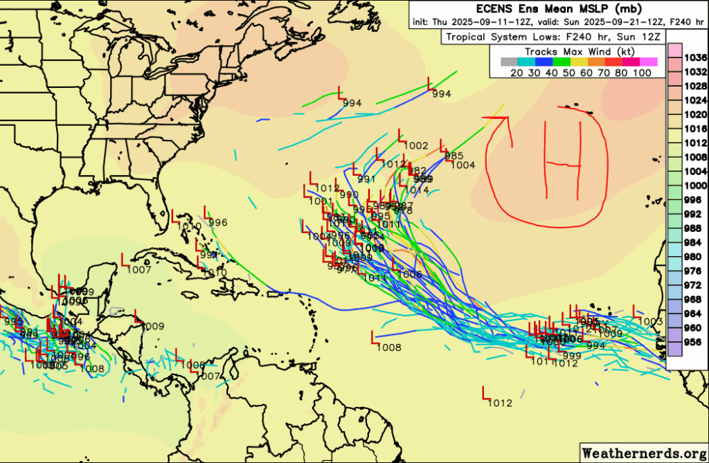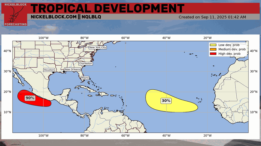 A 30 percent chance area of development has been highlighted in the eastern Atlantic by the NHC. Models are currently in agreement that any development would turn out to sea around the Atlantic High, which is very far east. If the high is strong enough, and if the system is north enough, it will be pulled around the high and out to sea in the open Atlantic. As we know, things could change so we are keeping an eye on this.